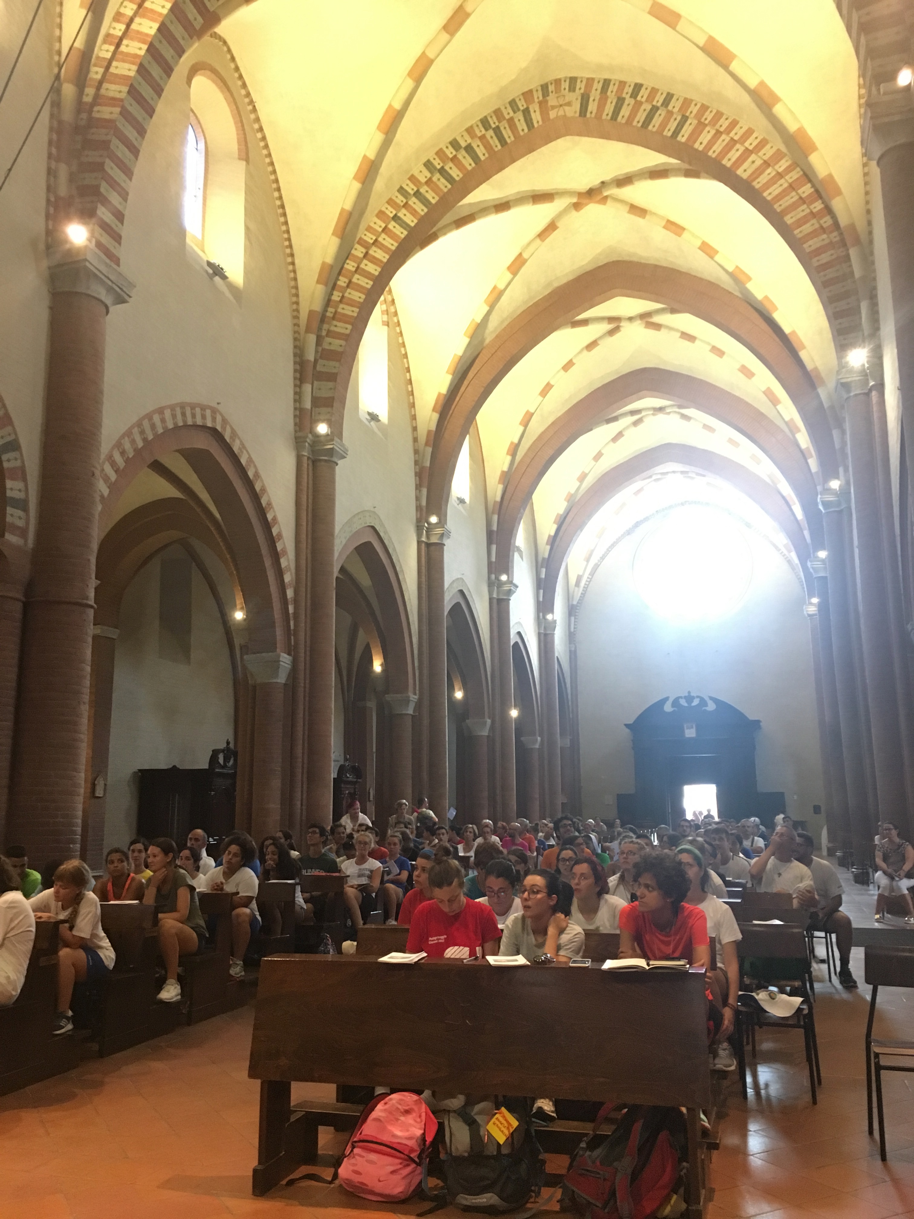 Prosegue la seconda tappa del nostro Pellegrinaggio verso Loreto. Oggi dopo la sveglia alle ore 6:00 la parrocchia di Moie ci ha offerto un’abbondante colazione sul sagrato della chiesa. Poco dopo abbiamo iniziato la preghiera, presieduta dal vescovo di Jesi, che ci ha dato l’occasione di continuare la meditazione quotidiana sulla Parola. Al termina della preghiera ci siamo messi in cammino alla volta di Jesi e dopo due ore di strada, tra chiacchierate e canti, abbiamo raggiunto il centro città dove, divisi per gruppi, abbiamo preso parte ad alcune attività di servizio che ci hanno coinvolto in alcune realtà diocesane. Nel servizio abbiamo avuto modo di condividere e metterci in gioco e sperimentare un altro lato dello stare insieme. Dopo pranzo ci siamo rimessi in cammino e abbiamo raggiunto (in treno) l’abbazia cistercense di Chiaravalle che ci ha accolto nella sua bellezza, e dopo un breve momento di accoglienza siamo nuovamente stati divisi in gruppi e abbiamo avuto modo di incontrare la pastorale giovanile di Senigallia che ci ha dato l’opportunità di vivere alcuni laboratori e attività. Alle 18:30 abbiamo celebrato l’Eucarestia presieduta dal vescovo di Senigallia, mons. Franco Manenti, e ci siamo subito dopo divisi nelle famiglie ospitanti per rinfrescarci e cenare. In serata ci siamo recati alla parrocchia di Marina di Montemarciano dove davanti alla disarmante bellezza del mosaico absidale, ad opera di Rupnik, abbiamo condiviso un momento di preghiera e comunità, al terminale del quale siamo tornati in famiglia per la notte.